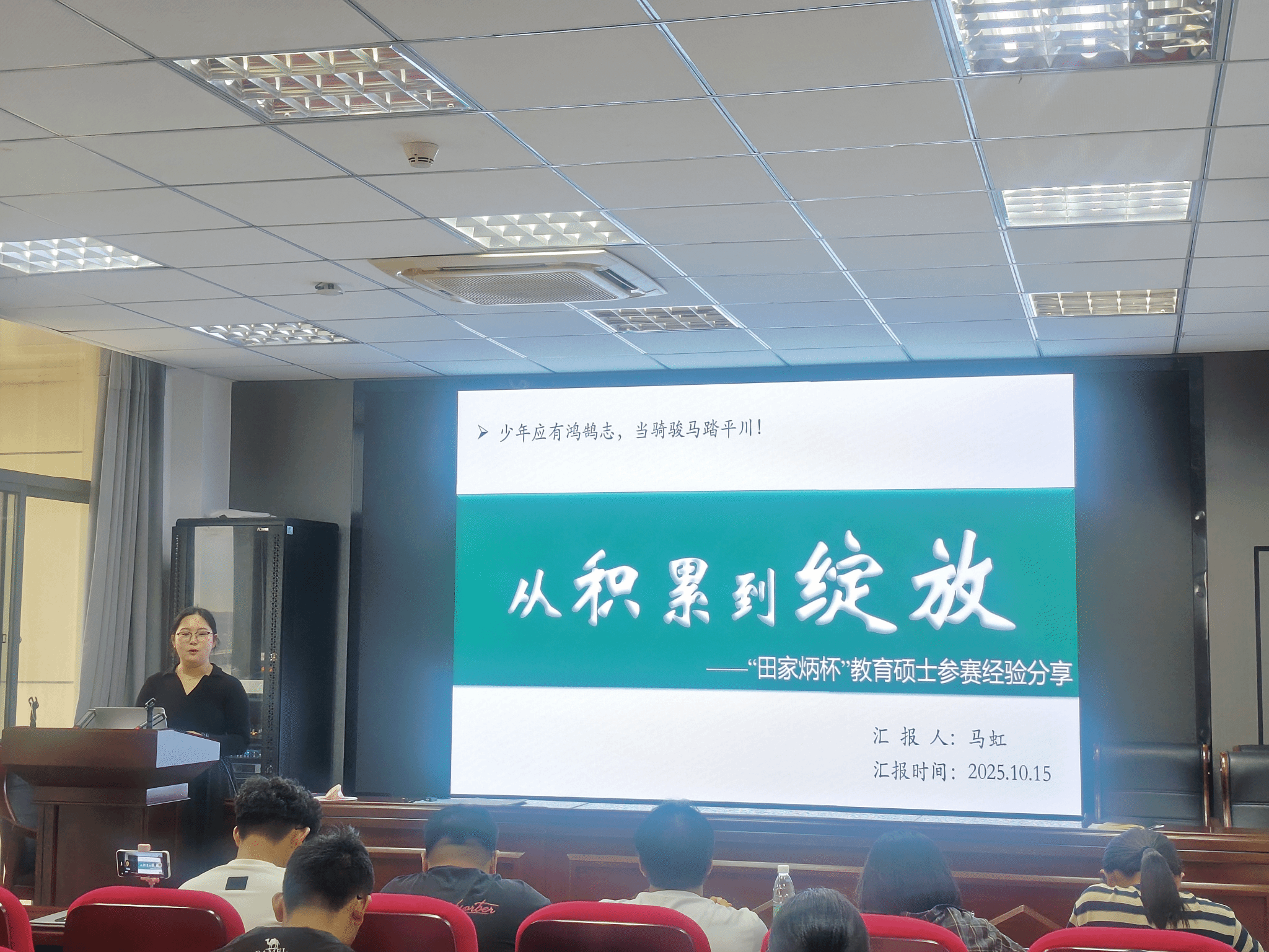 分享会由化学化工学院副院长官叶斌主持,邀请在2025年“田家炳杯”全日制教育硕士专业学位研究生学科教学(化学)专业教学技能大赛决赛中荣获二等奖的马虹同学、三等奖的王嘉瑞禾同学以及获得优秀教学设计奖的邓婷、张伊伟四位同学担任主讲,围绕竞赛准备与教学能力提升展开深度交流。
