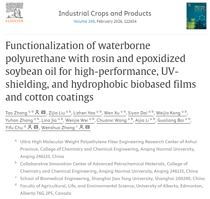 近日,化学化工学院张涛博士在国际权威农林科学期刊《Industrial Crops and Products》(中科院农林科学大类1区TOP,影响因子IF=6.2)在线发表题为“Functionalization of waterborne polyurethane with rosin and epoxidized soybean oil for high-performance, UV-shielding, and hydrophobic biobased films and cotton coatings”的研究论文。安庆师范大学为该论文第一单位和通讯作者单位,加拿大阿尔伯塔大学和上海交通大学为共同通讯作者单位。