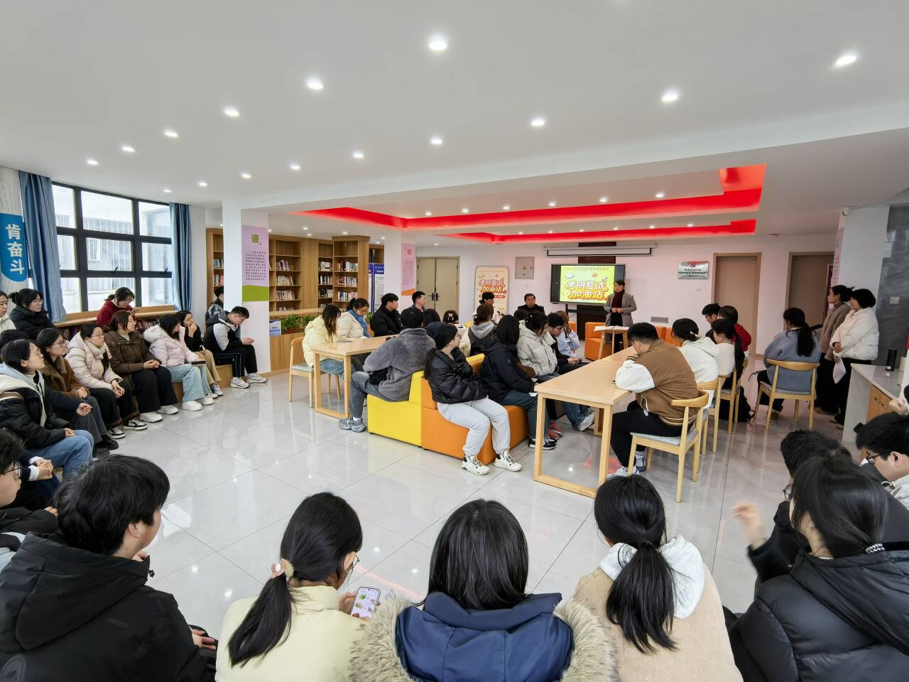 3月18日上午,学校书香社区内座无虚席,学院党政一把手走进“一站式”学生社区,与学生面对面开展“考研复试加油站”活动,60余名毕业生及辅导员代表现场参与。活动由学院党委副书记、纪委书记鲍青燕主持。